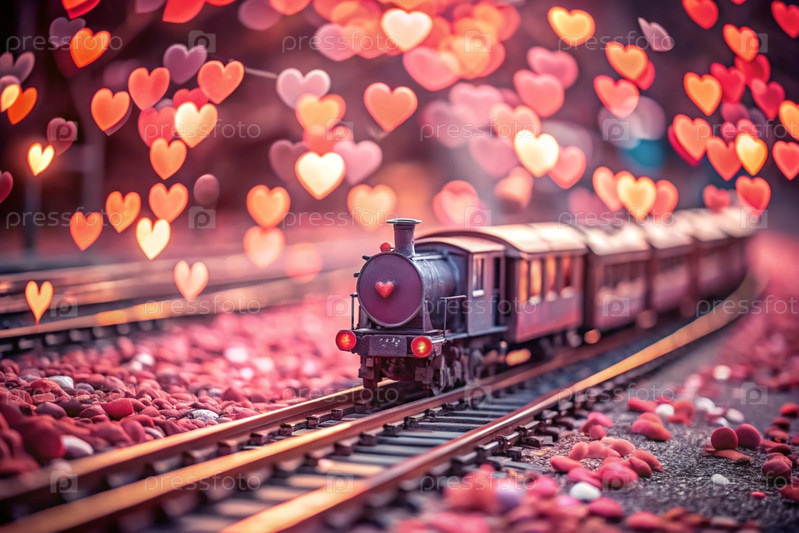Путешествие любви. поезд и сердца вокруг. подарок для любимого человека в День святого Валентина - это как романтическое путешествие. баннер с предложениями и акциями от туроператора