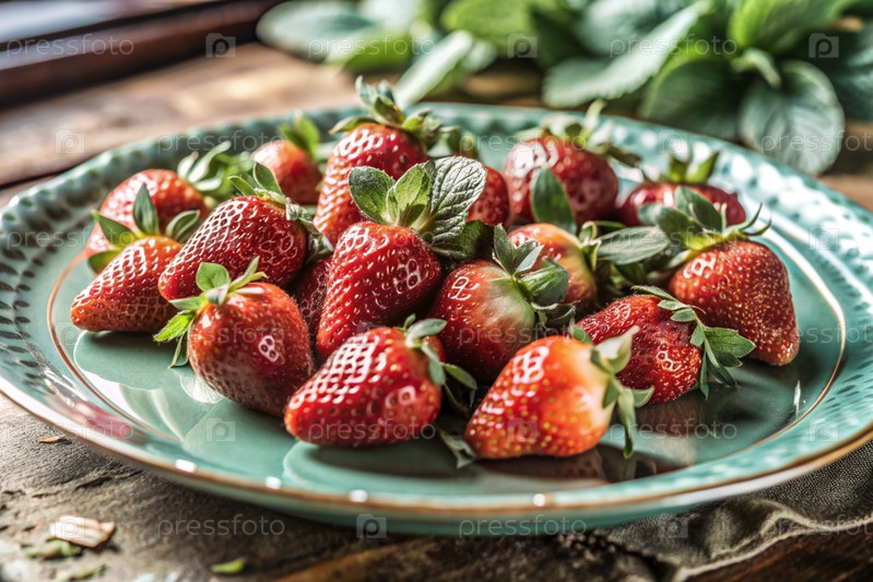 Закрытие свежих клубники. Вкусные ягоды и фрукты ярко-красные с капельками воды. Вегетарианство. Здоровое питание. Свежие плоды на столе