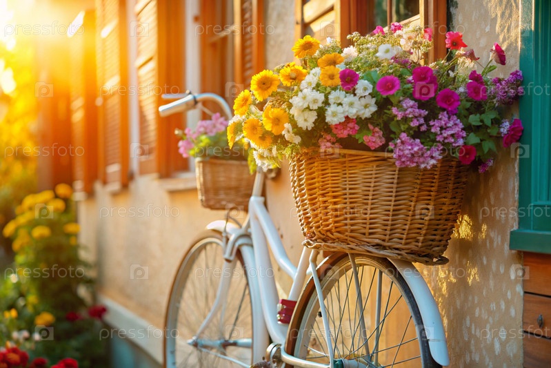 Красивый ретро-велосипед с цветами в корзине стоит за пределами летнего дома.Лето наступило.Городской транспорт