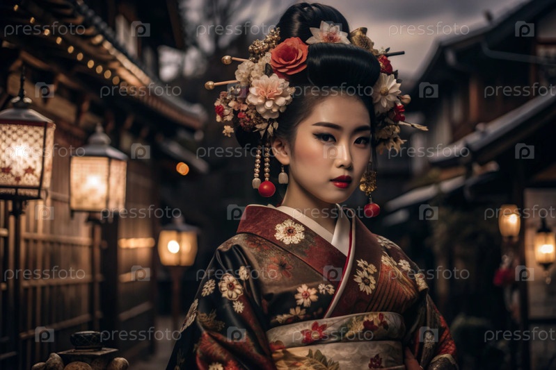 Японская девушка в традиционном национальном костюме - кимоно. На фоне домов, фонарей и вишневых деревьев портрет символизирует традиции и культуру народа Японии
