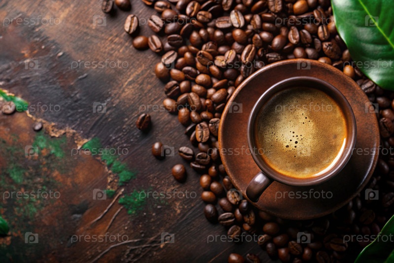 Чашка освежающего черного кофе и кофейных зерен на старом зеленом столе