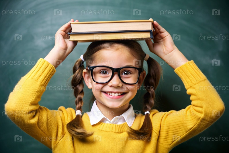 Красивая девушка с очками и книгами на голове. Ребенок впервые идет в школу. Ребёнок в классе со доской на заднем плане. Возвращение к школе