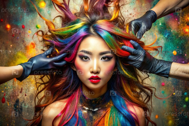 Творческий баннер для салона красоты или парикмахера. Модное профессиональное окрашивание волос. Красивая азиатская женщина с длинными многоцветными волосами. Взрыв цветов на голове