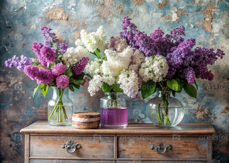 Красивые белые и фиолетовые лиловые цветы в стеклянных вазах и бутылках на деревянном шкафу. Букет цветов в вазе. Светлый, белый, розовый и синий цветочный фон