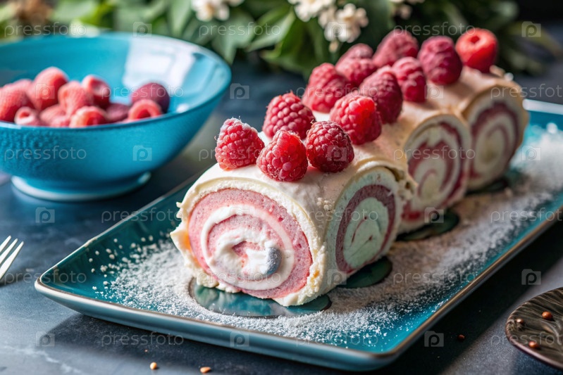 Швейцарская губка с малиной, вкусный фруктовый и сливочный десерт наполненный кремовым сыром, украшенный свежими малинами