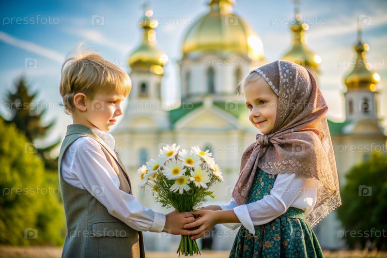 Всероссийский день семьи, любви, верности. милый мальчик и девочка с букетом ромашек на фоне православной церкви. День святого Валентина Петра и Февронии. религия, христианство