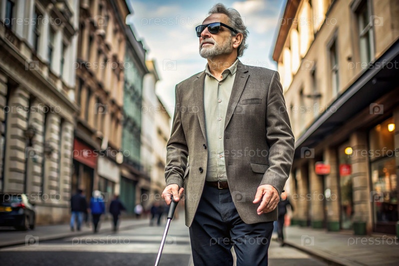 Инвалидность. Потеря зрения. Слепой мужчина с тростью и темными очками идет по улице города. Международный день слепых 13 ноября