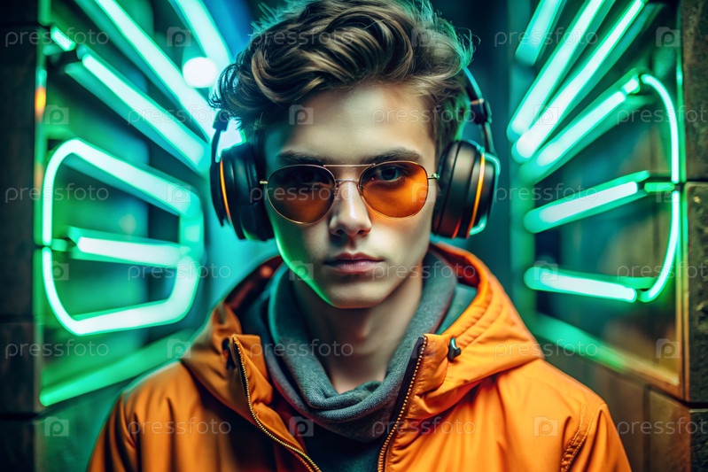 Молодой красавец в солнцезащитных очках слушает музыку на больших беспроводных наушниках, стоя среди неоновых вывесок
