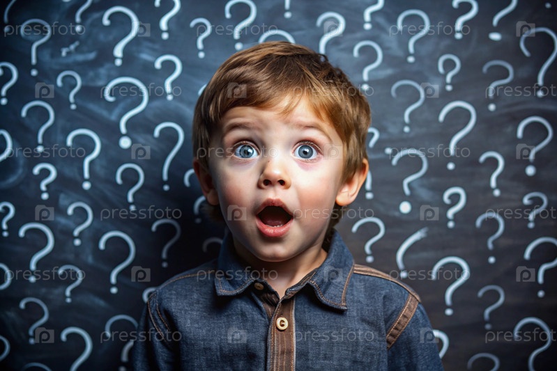 Развитие и образование детей. удивленный мальчик на темном фоне с вопросительными знаками. мозговой штурм, вопросы детей и концепция идеи