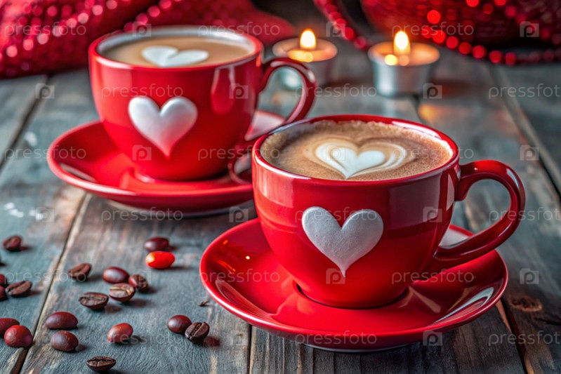 Концепция Дня святого Валентина для кафе и ресторанов красные чашки кофе латте с сердцами вокруг горячие напитки для влюбленных