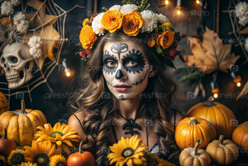 Концепция Хэллоуина. Ужасно. Костюмированная вечеринка. Красивая женщина с покрашенным черепом на лице и цветами на голове. Баннер, открытка