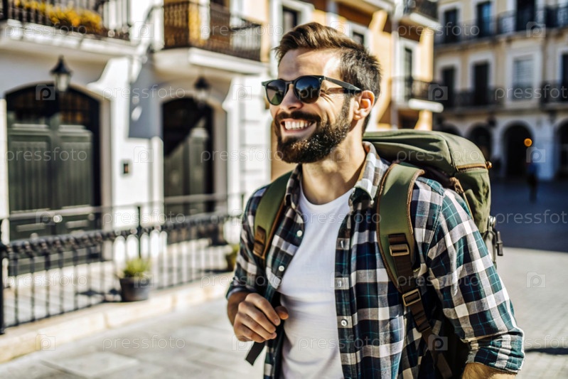 Портрет счастливого красивого хипстера-путешественника с рюкзаком и солнцезащитными очками. Сольное путешествие, образ жизни. Молодой турист наслаждается отдыхом в солнечный день
