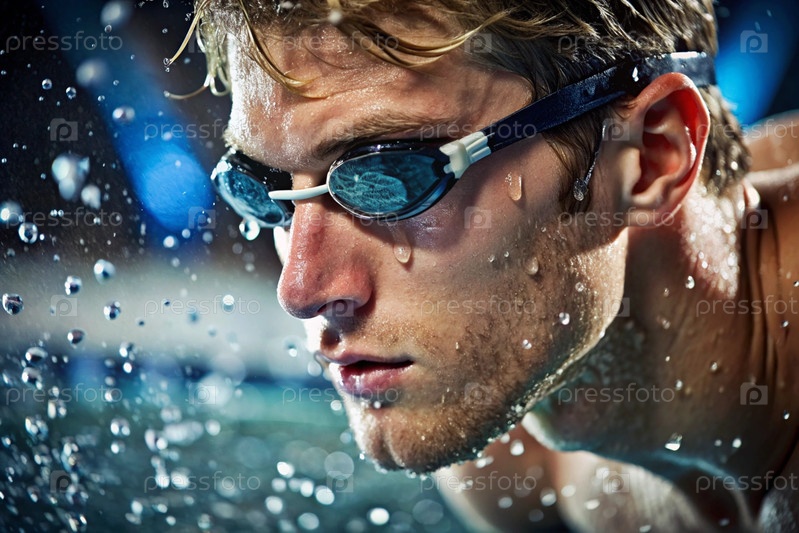 Спортивное плавание. Мужчины-плаватели. Спортсмен с очками в бассейне во время соревнований на близком расстоянии. Человек смотрит на камеру