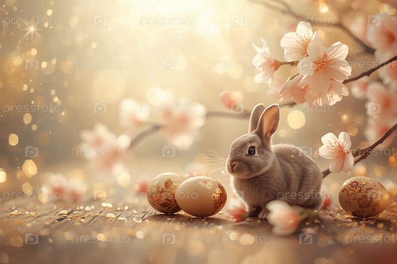 Концепция яркого пасхального праздника в 2026 году.Концепция ярких пасхальных праздников.Нежные розовые пасхальные яйца, кролики и вишневые ветви на деревянном фоне