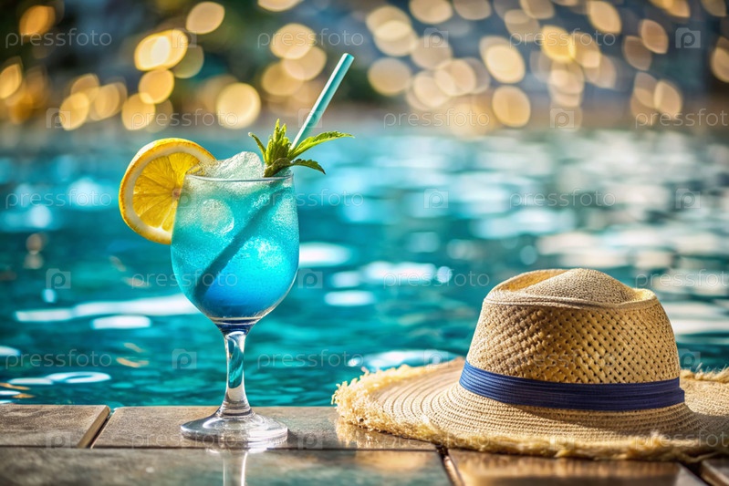 Стакан вкусного голубого коктейля 'Голубая лагуна' на фоне бассейна. алкогольный коктейль сочный фруктовый синий с ликером Curacao, кубиками льда и ломтиком лимона