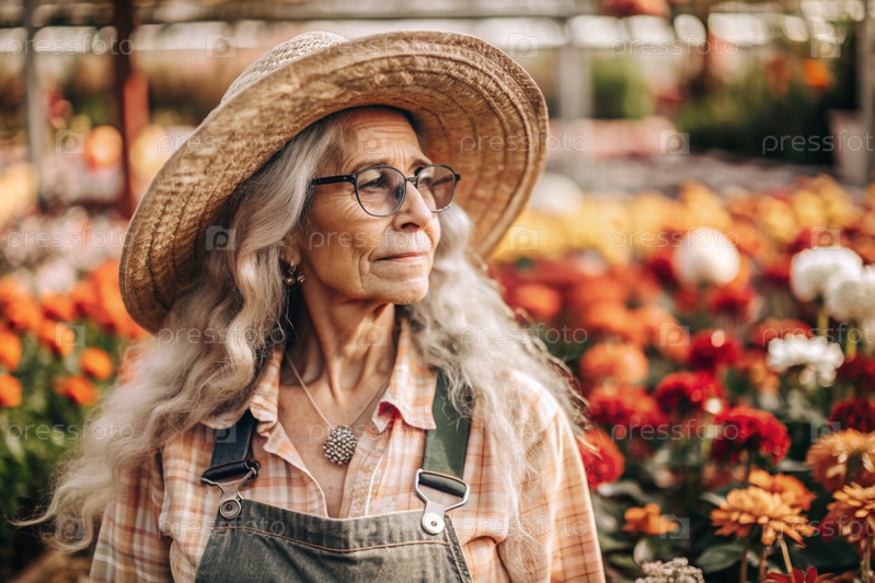 Пожилой садовник с седыми волосами в комбинезоне в уютной цветочной теплице