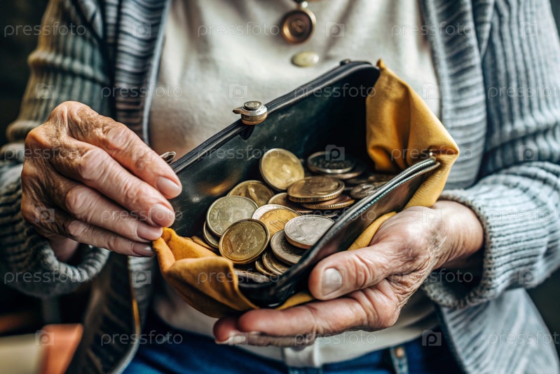 Бедность, проблемы с пенсией. Пожилой пенсионер держит старый кошелек. Последние деньги, трудности. Семейный бюджет с низким уровнем дохода