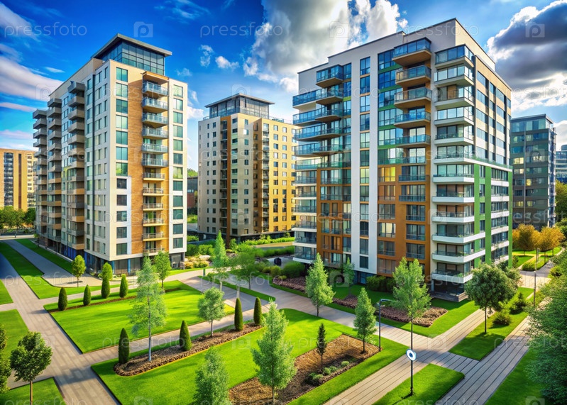 Современные многоэтажные жилые дома. Строительство новых жилых кварталов. Новые здания. Строительный бизнес. Ипотека для нового экологически чистого жилья