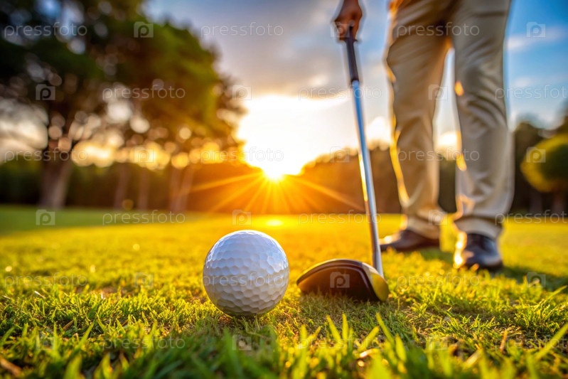 Баннер. белый мяч и металлическая клюшка для гольфа лежат на газоне в руках мужчины среди заката солнца. реклама матча по гольфу в кантри-клубе. свободное место для текста