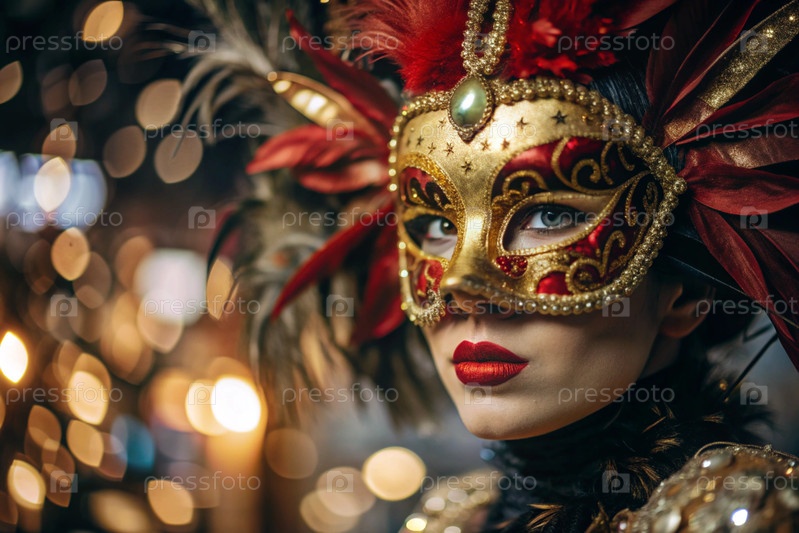 Карнавал Венеции.Закрытие женщины в украшенной карнавальной маске.Яркие цвета передают атмосферу празднования и роскоши