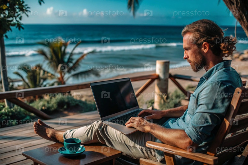 Молодой бизнесмен-фрилансер работает на ноутбуке, отдыхая у моря или делая покупки в Интернете