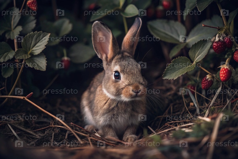 Красивый серый кролик, сидящий среди весенних листьев и клубники.Охота на животных.Садовые вредители