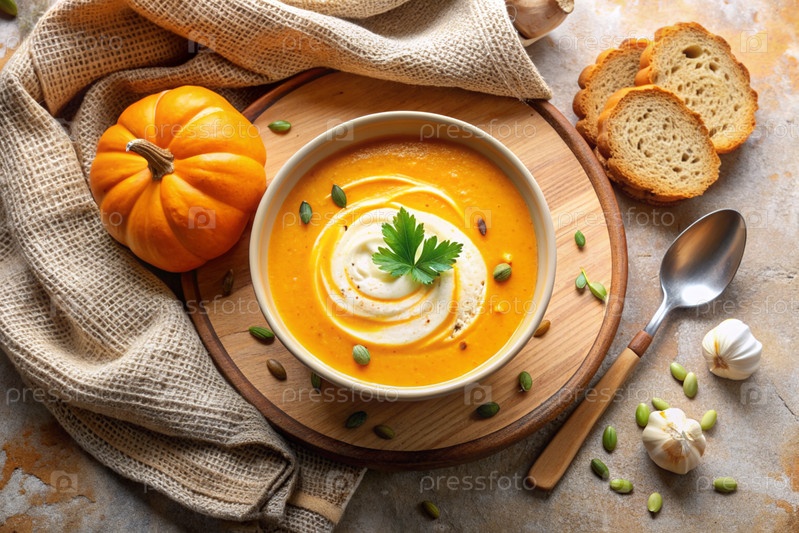 Традиционный мягкий тыквенно-кремовый суп с сливками и семьями тыквы на бежевом бетонном фоне