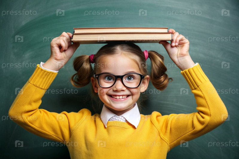 Красивая девушка с очками и книгами на голове. Ребенок впервые идет в школу. Ребёнок в классе со доской на заднем плане. Возвращение к школе