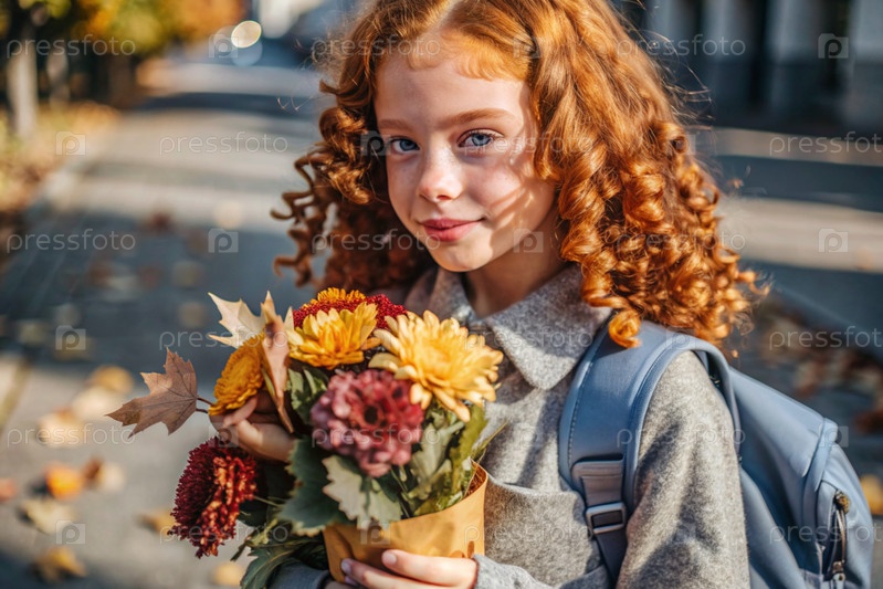 Красивая рыжеволосая девушка с очками и букетом осенних цветов впервые идет в школу. Ребенок со школьной сумкой, книгой и цветами. Малыш на городской улице