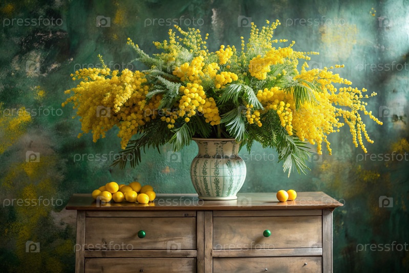 Красивый букет желтой мимозы в стеклянной вазе и флаконы на древнем деревянном шкафу. Букет цветов в вазе во внутренней части дома. Желтый, зеленый цветочный фон