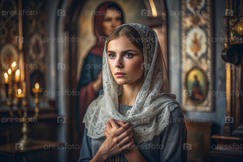 Портрет красивой молодой женщины с платками в православной церкви.Девушка молится в церкви среди икон
