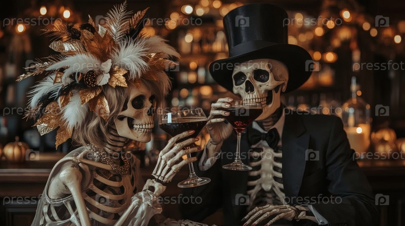Пара любителей скелетов с коктейлями в баре.Хэллоуин или День мертвых