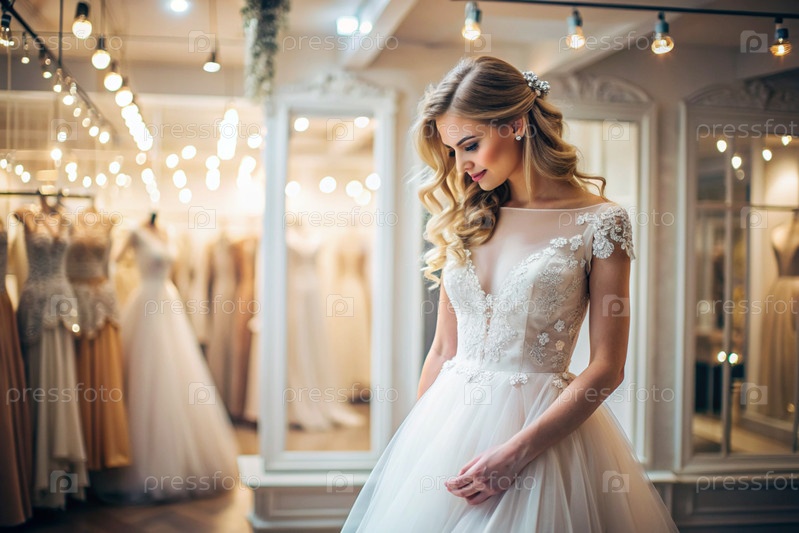 Аренда и покупка свадебных платьев для мероприятий. близко. красивая девушка Невесна пробует на себе элегантное белое свадебное платье в роскошном брачном салоне