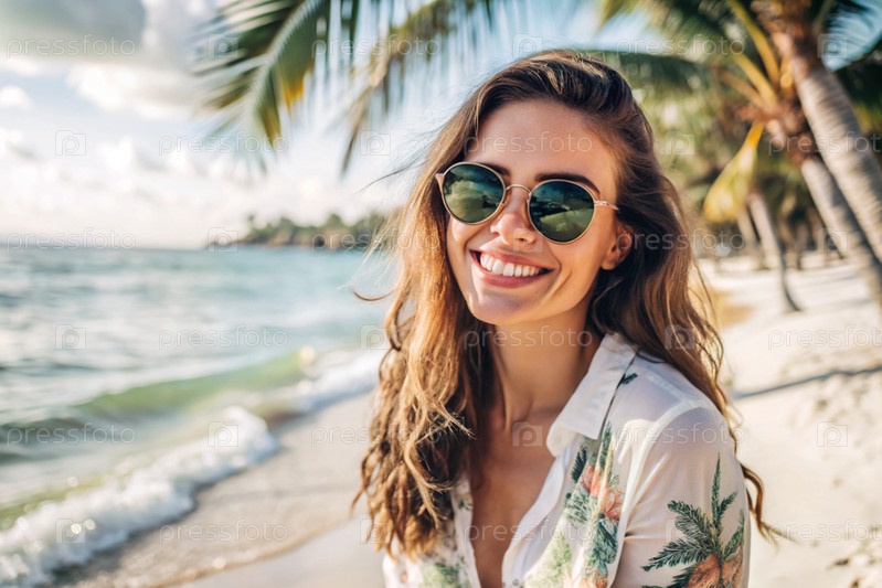 Красивая девушка в белой хлопковой рубашке и солнцезащитных очках на океане на фоне пальмовых деревьев. она улыбается и смотрит в камеру. летние каникулы и праздники