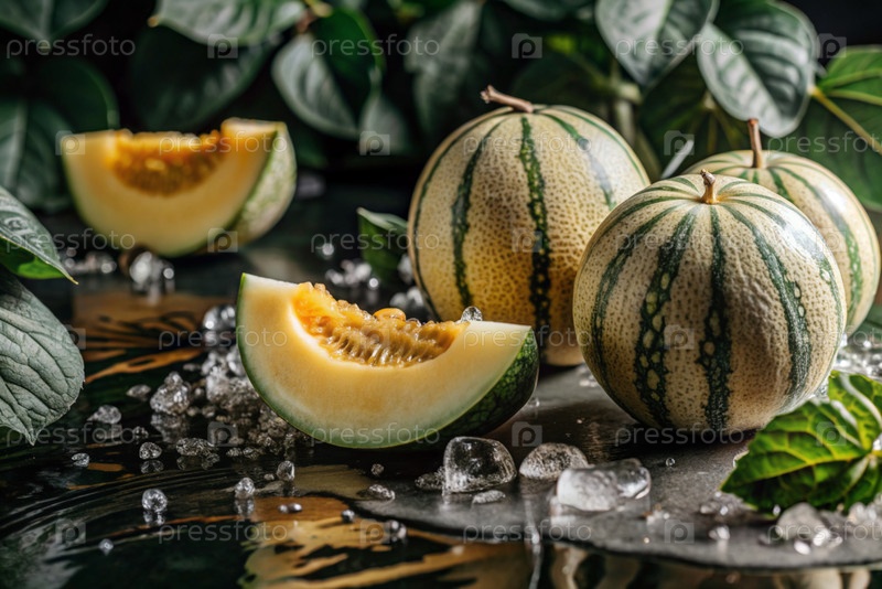 Свежие дыни.Вкусные ягоды и фрукты ярко-желтого цвета с каплями воды.Вегетарианство.Здоровое питание.Свежий плод на столе