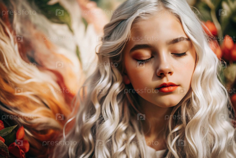 Портрет красивой маленькой блондинки с длинными волнистыми волосами и вдумчивым взглядом.Волосы развиваются и создают ощущение легкости и естественности