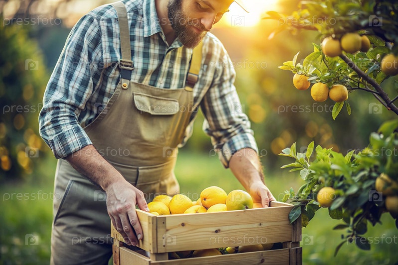 Сельскохозяйственная промышленность. Деревянный ящик с лимонами в руках фермера. Садовник собирает богатый урожай. Ближе, солнечный свет. Осенний плодовый сбор