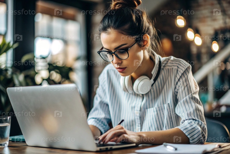 Молодая женщина фрилансер в очках и наушниках работает на ноутбуке или делает покупки в интернет-магазине