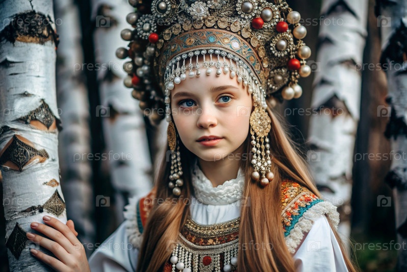Красивая девушка в традиционном русском национальном костюме.Перед березовым ростом.Портрет символизирует традиции и красоту русского народа