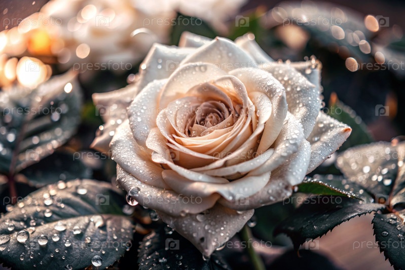 Кремовая роза красивого цвета кофе или шампанского, покрытая росой на рассвете. Красивое солнечное сияние. Фон изображения выполнен в зеленых и бежевых тонах. Естественный, экологически чистый естественный фон