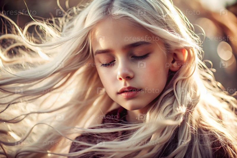 Портрет красивой маленькой блондинки с длинными волнистыми волосами и вдумчивым взглядом.Волосы развиваются и создают ощущение легкости и естественности