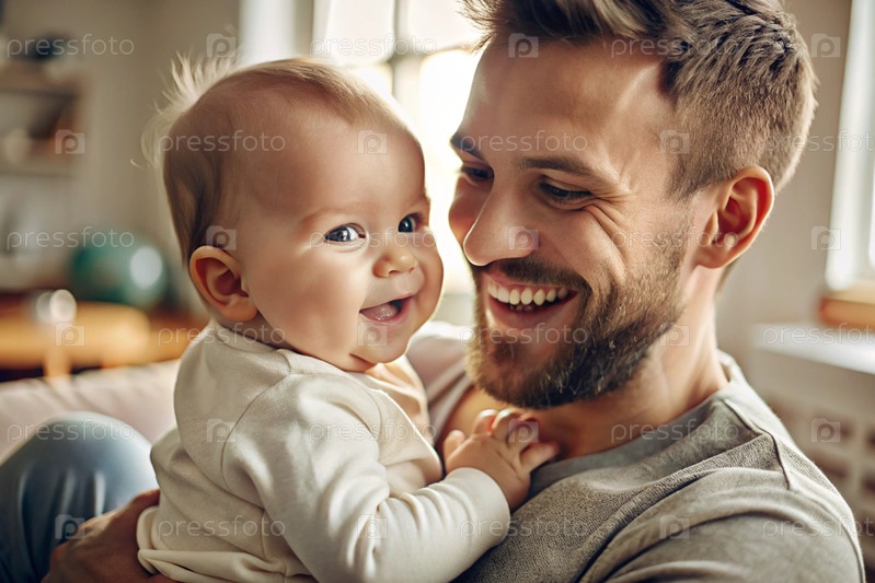 Прекрасный ребенок в объятиях отца. Счастливый ребёнок улыбается на камеру. Ребёнок весело смеётся. Концепция Дня отца