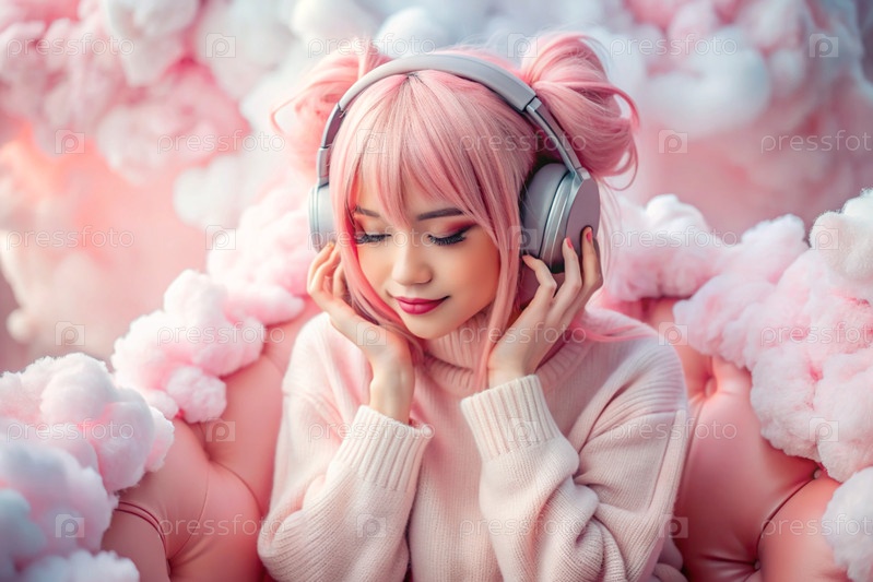 Молодая красивая японская девушка с розовыми волосами в аниме слушает музыку на беспроводных наушниках в розовых облаках