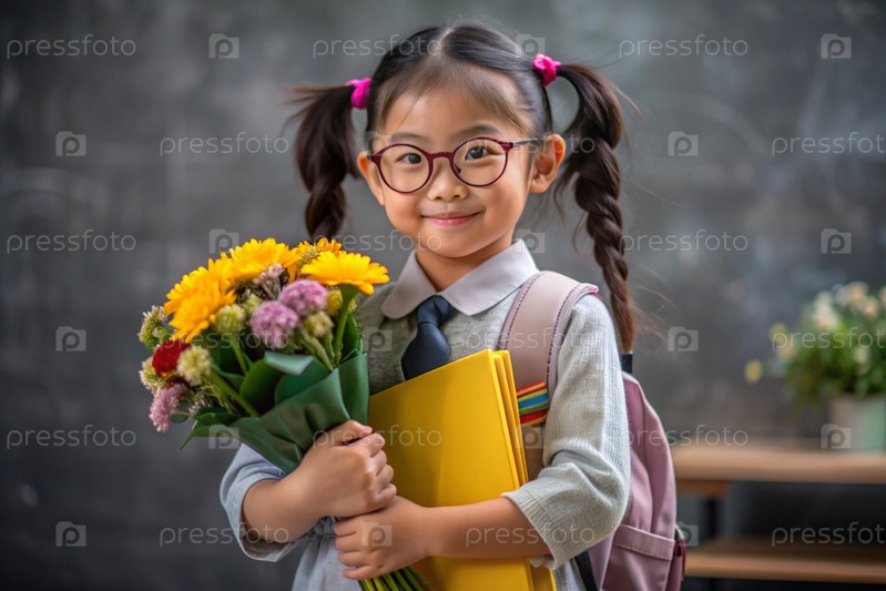 Первоклассный азиат с очками на доске. Девушка держит цветы в руках. Ребенок пойдет в школу впервые. Ребёнок с рюкзаком, книгой и цветами. Возвращение к школе