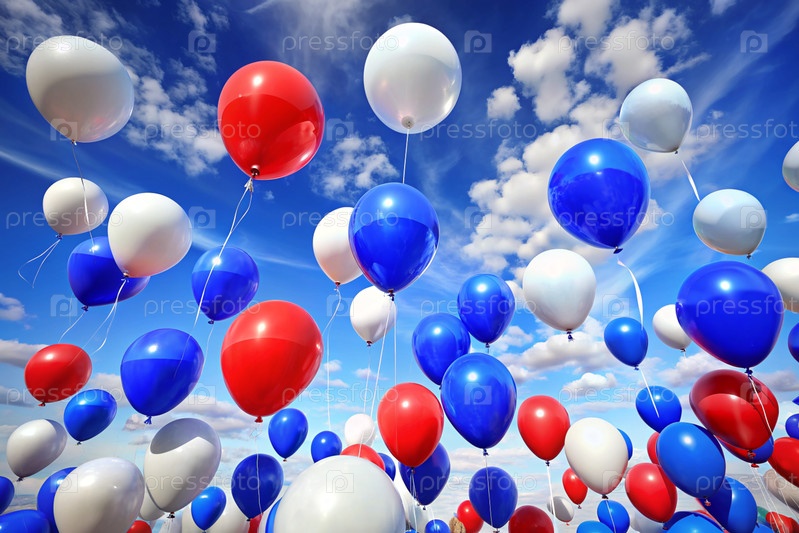 Концепция празднования Дня России 12 июня.Балоны в цветах триколора России.Белый, синий, красный летают по голубому небу