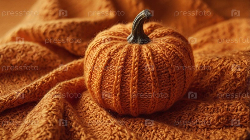 Красивый осенний фон. Хэллоуин, День благодарения. Оранжевая вязаная тыква на фоне оранжевого волокна