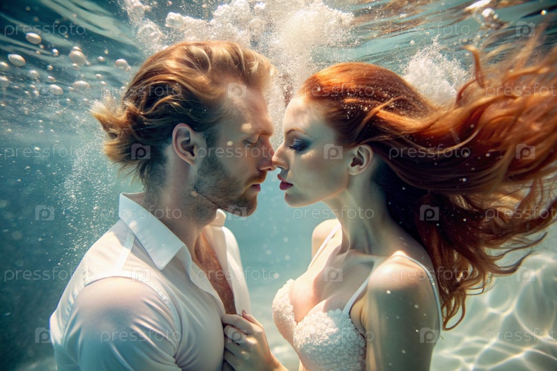Красивые влюбленные. мужчина и женщина под водой на глубине. романтические отношения. необычное свидание