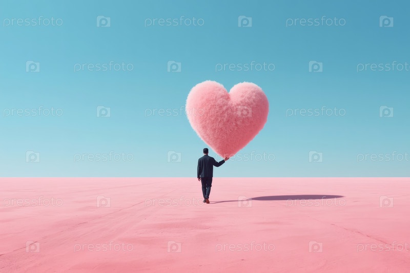 День святого Валентина. Сюрреалистическая сцена. Мужчина в черном костюме идет по розовому пространству под голубым небом. Он держит большое пушистое розовое сердце в руке