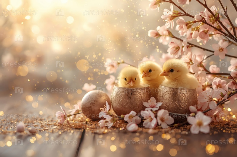 Концепция яркого Пасхального праздника. Нежные розовые пасхальные яйца, желтые курицы и вишневые ветви на деревянном фоне. Концепция ярких пасхальных праздников в 2026 году