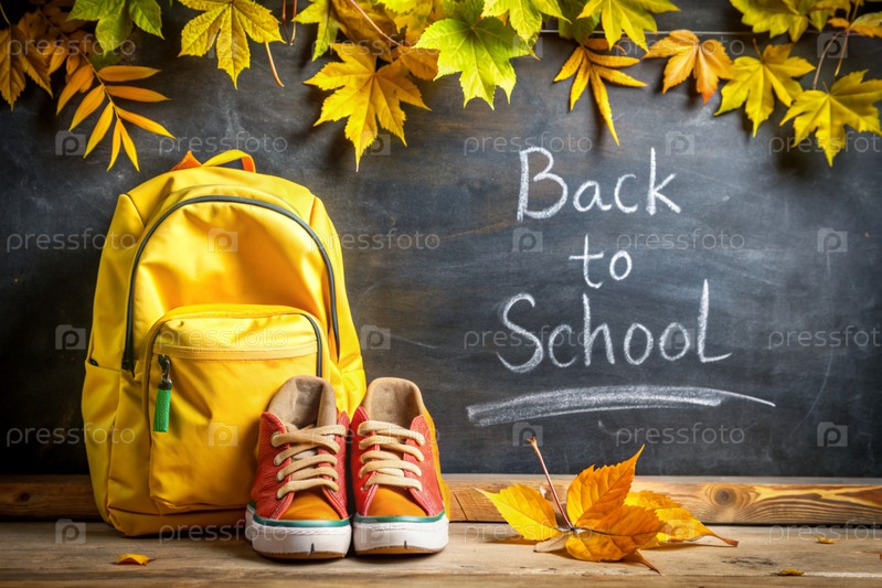 Праздник приходится на 1 сентября. Рюкзак, кроссовки и карандаши. Знак 'Возвращение в школу' на доске. Концепция нового учебного года в школе. Давайте вернемся в школу. День осенних знаний